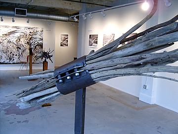 Bros. collaborative sculptures combine structural steel with wood. Three