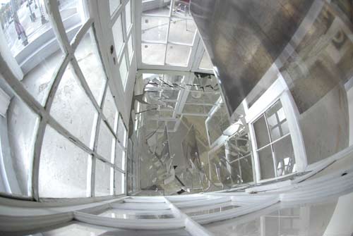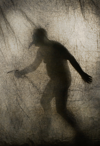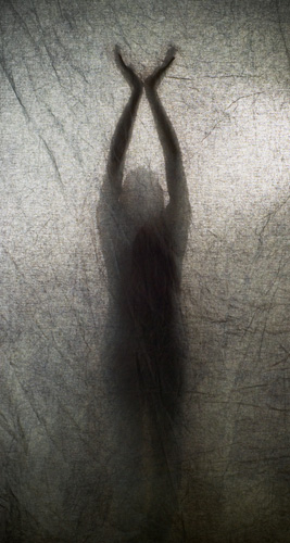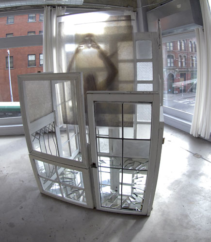 Nichole DeMent uses shadow images in her new body of work to suggest aspects of human nature that are unobserved. Figures of human-like forms characterize various personalities within individuals, as well as cultures, such as the image above left, Monkey King Stealing Immortality, which is based on the Chinese myth of the same name. The installation piece shown above right, House of the Gathering, is an expansion of this body of work and a collaboration with partner, Stephen Rock. The installation art piece is made of a box of white-washed window frames and broken mirrors that encase two images printed on transparent film furthering the metaphor of looking for things that are not easily viewed and the many perspectives in which to view them in.