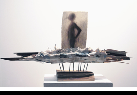 mixed process sculpture: photos, wax, wood, nails, paint and paper collage
