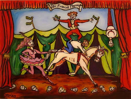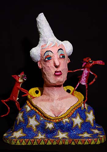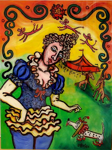 Cheri's newest work in papier mache sculpture and reverse oil on glass paintings come to full color life with a wild sideshow cast of circus men and women and one crazy financial planner. The life size busts of three women with their wild cohorts convey O'Briens pernicious humor, love of circus and theatre characters. Cheri's reverse oil on glass paintings have a luminescent quality that interestingly contrasts with the humorous subject matter. Concurrently, Cheri is completely a large public art commission in dyed concrete. Papier mache and concrete? All she needs is some scissors.