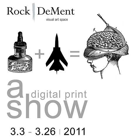 Rock|DeMent visual art space presents ink + jet = a digital print show including artwork by premiere Northwest artists from diverse mediums. Featuring internationally recognized cartoonist Jim Woodring; award winning illustrator Ken Orvidas; acclaimed photo-based artist and Professor of Art at UW, Paul Berger; video producer and 3D artist Ted Grudowski; ecstatic imaging and photography by Ron Huden; and mixed media artists pushing the envelope using new technology and traditional media Stephen Rock and Nichole DeMent.